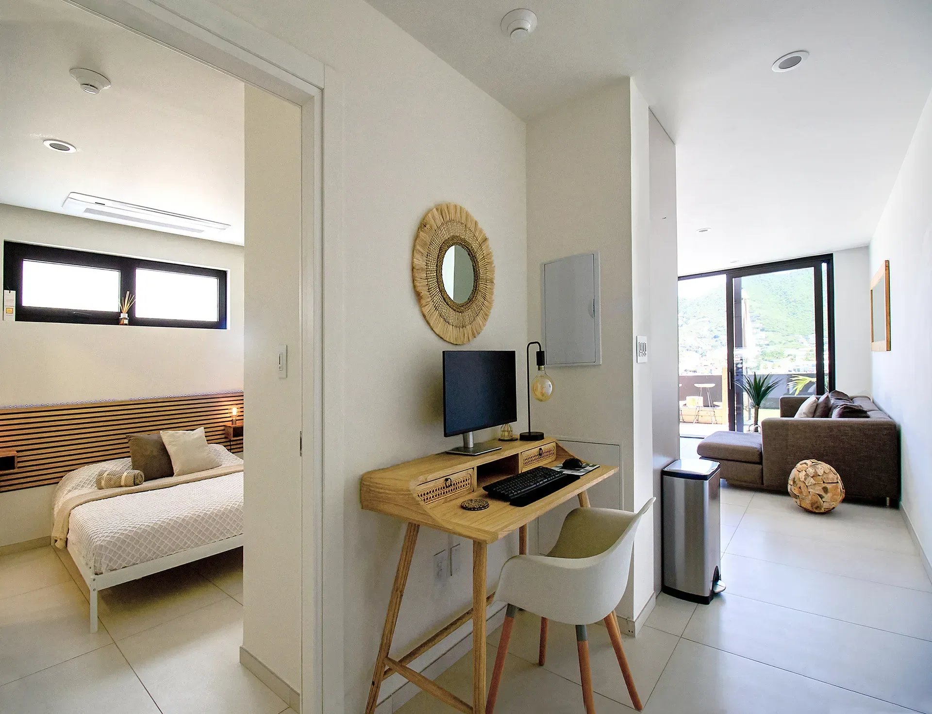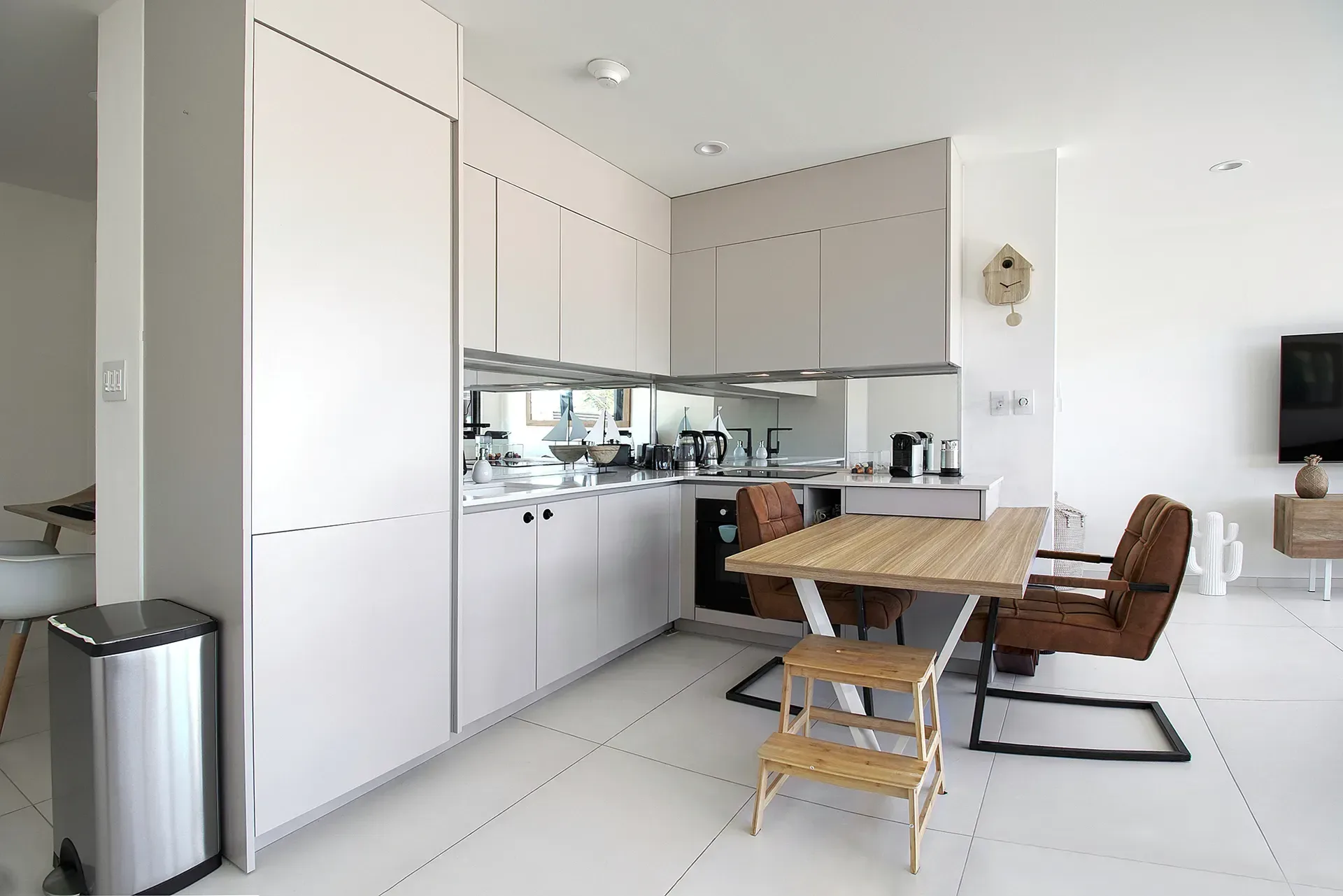 Fully equipped kitchen and bright living space providing a welcoming area to relax or entertain guests.